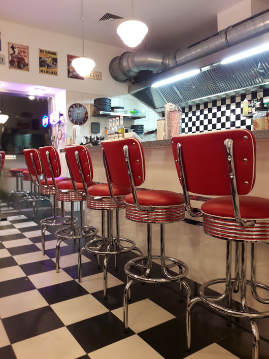 Kommt man rein, fühlt man sich direkt wie in einem US-Roadmovie. Der Style des Diners – mit roten Leder-Sesseln und schwarz-weißen Fließen lässt einen beinahe schon glauben, man sei mit dem Delorian aus Back to the Future vor der Tür gelandet und gleich würde Doc Brown auf der Suche nach dem Flux-Kompensator zur Tür hereinkommen.