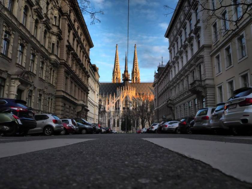Die Votivkirche gehört zum Standardrepertoir eines jeden Wien-Fotografen. Doch mehr als die Hälfte nutzt die Perspektive von der Ringstraße aus frontal zum Hauptportal. Die Gassen dahinter jedoch bieten tolle Rückansichten. Wenn man dann auch noch das Licht der untergehenden Sonne erwischt und sich traut, sich mal auf den Zebrastreifen zu setzen (es kam kein Auto, es hat jemand aufgepasst), entstehen solche Bilder.
