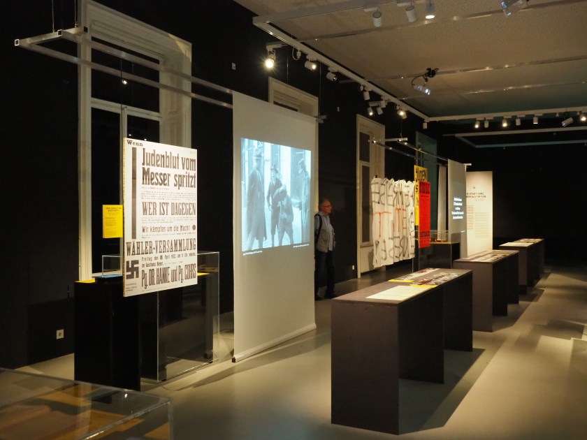 Die Ausstellung zeigt, wie die Ausschlussmechanismen einzelner Gruppen funktionieren und wie sie schließlich in Gewalt münden können – Gewalt gegenüber Juden, Ausländern, Flüchtlingen. Im Fokus stehen die 5 Leinwände, die Szenen aus dem Film zeigen. Schaut man hinter die Leinwände, sieht man etwa Wahlplakate oder Aussagen einzelner Politiker (aus allen Parteien übrigens!). Man wird an einzelne, teils noch gar nicht so lange zurückliegende Ereignisse erinnert, etwa das Bild des glücklichen Flüchtlingsmädchens, das sich im Sommer 2015 dank der Feuerwehr abkühlen darf – dem werden die Facebook-Postings zu dem Thema gegenübergestellt. Gezeigt werden auch Schmierereien im öffentlichen Raum oder auch das Burschenschafter-Gesangbuch, das kürzlich in den österreichischen Medien war.