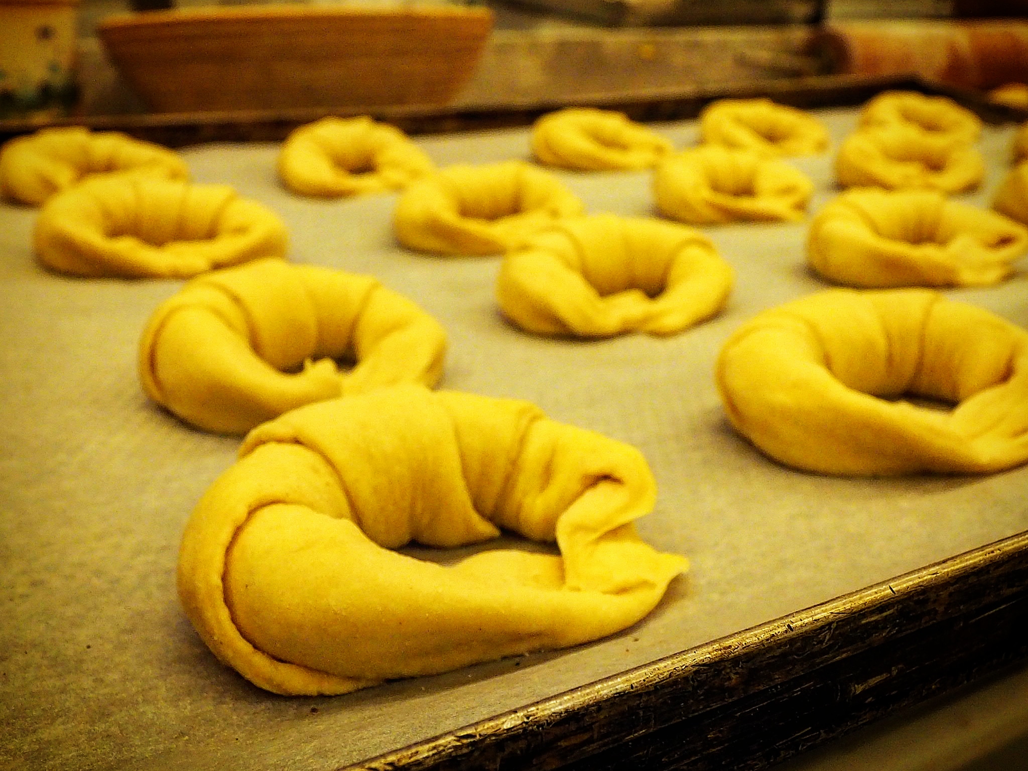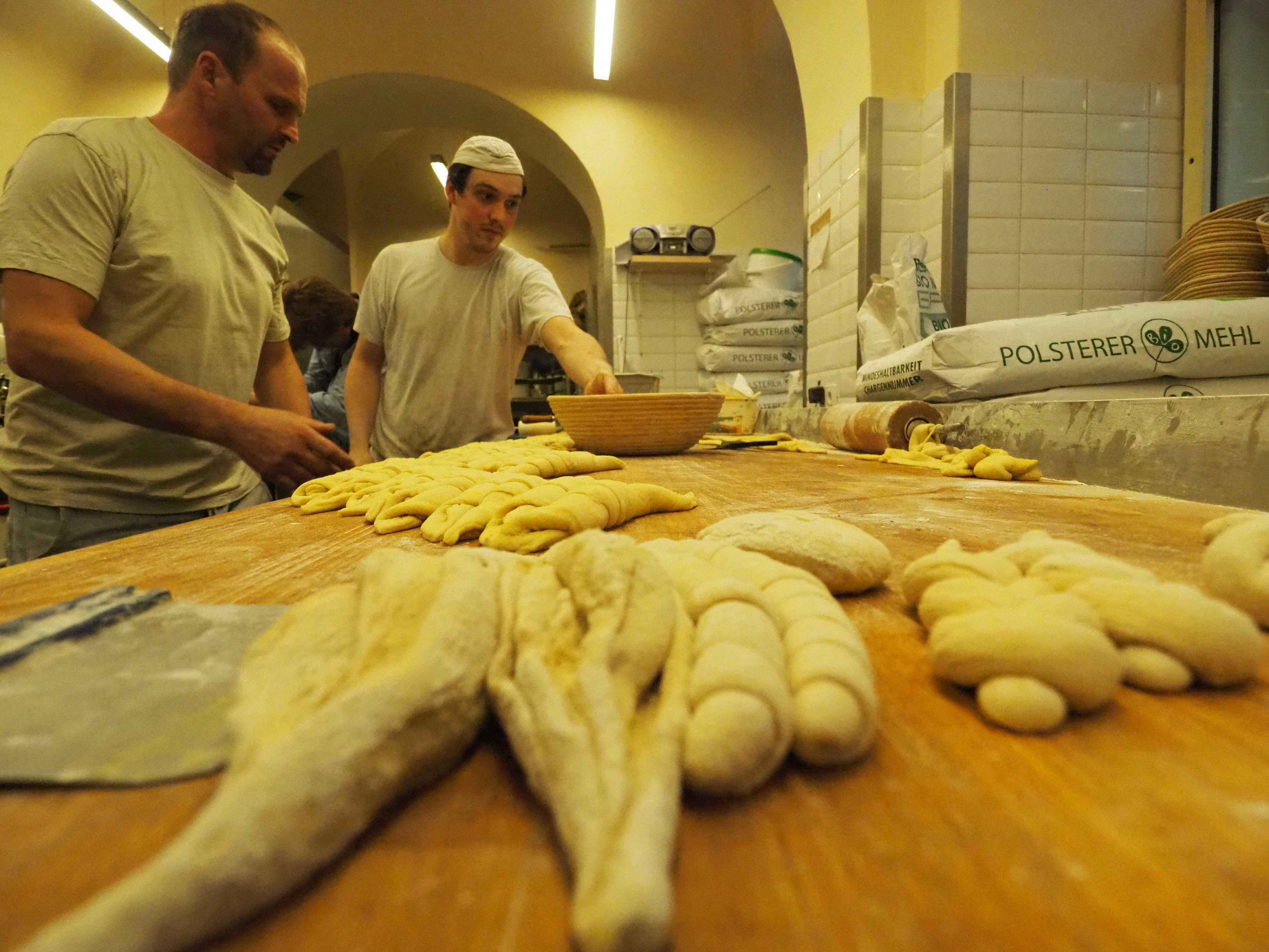 Seiner handwerklichen Philosophie folgend, sieht die Arbeit in der Backstube auch noch aus wie vor 100 Jahren. Der Teig wird zwar primär von Maschinen geknetet, aber jedes Stück Gebäck, jede Semmel und jedes Brot werden von Hand bearbeitet, was die Stücke wesentlich individueller macht – von der Standardisierung, wie man sie von den großen Bäckereiketten kennt, ist man hier jedenfalls meilenweit entfernt. Croissants werden hier noch mit geschickten Handgriffen aus dem Blätterteig geformt.