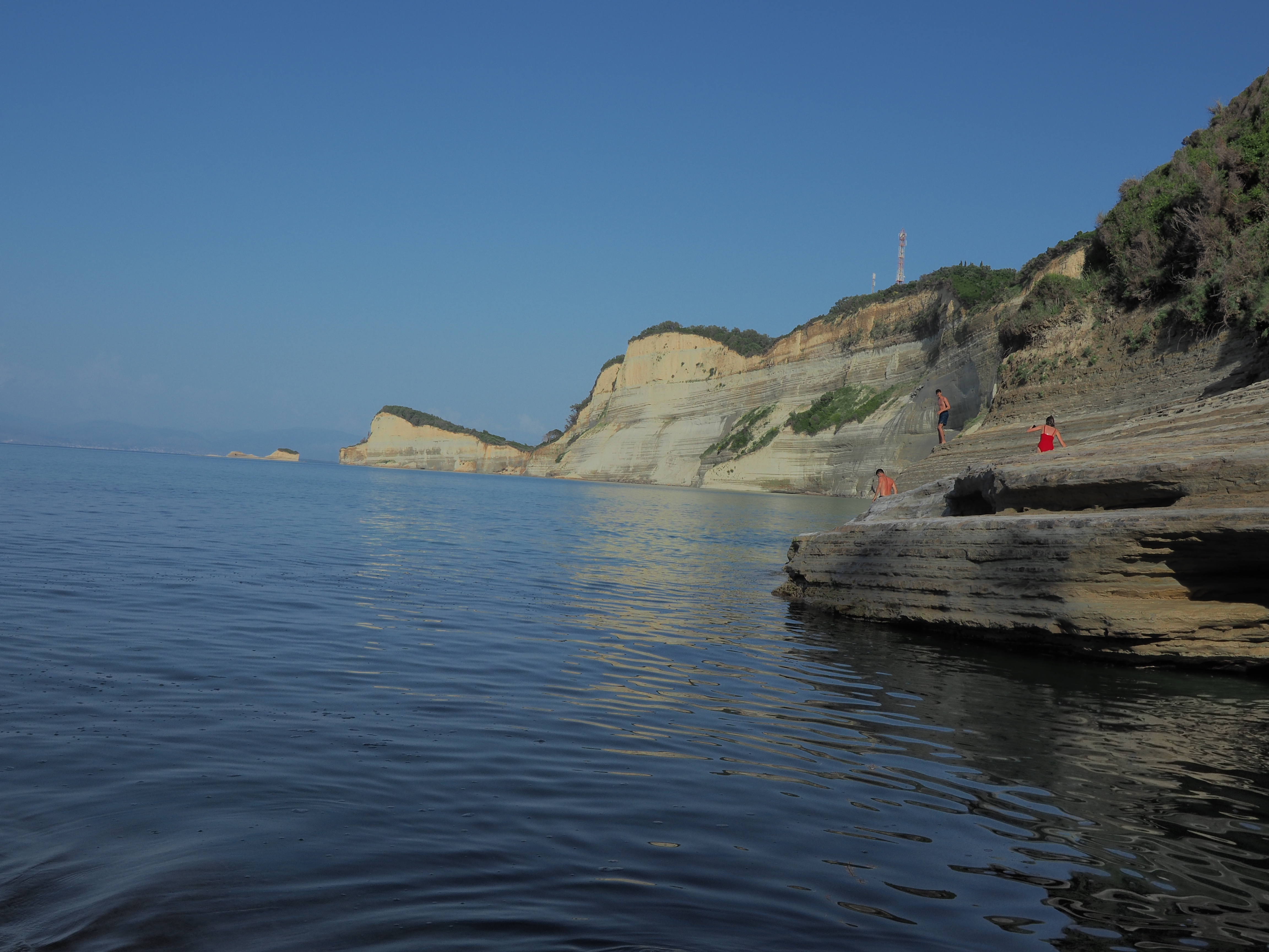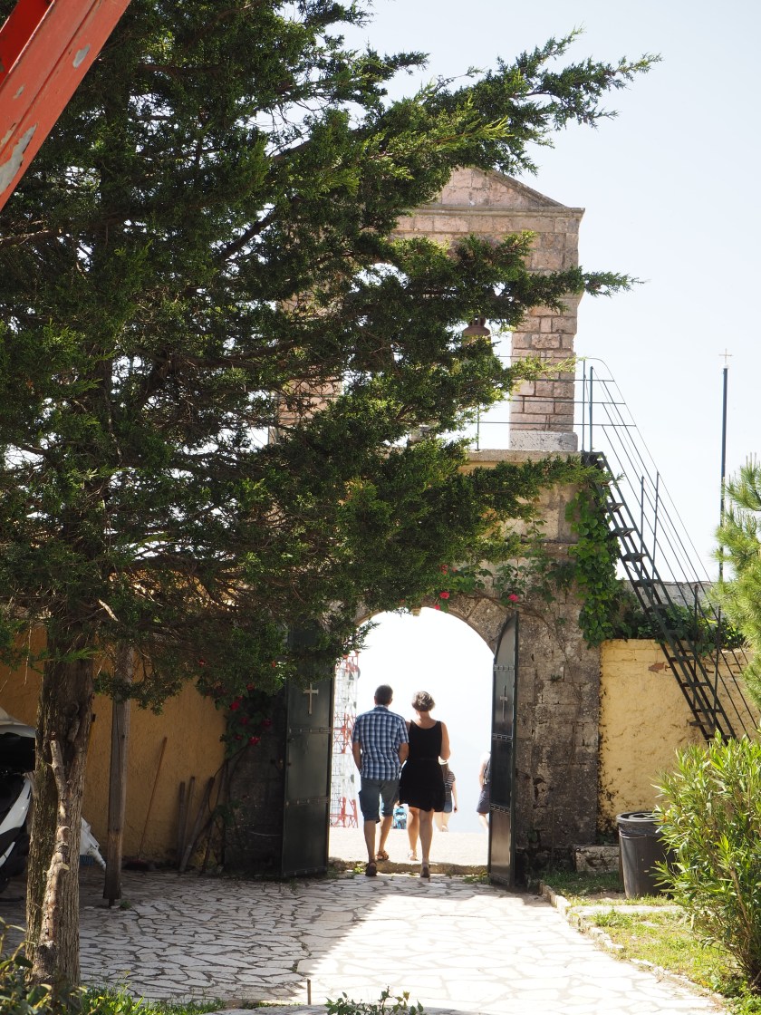 Aber die Geduld lohnt sich. Unmittelbar hinter dem Dorf kommen mehrere Restaurants mit Aussichtsterrasse, von der aus man weit auf das Meer hinaus, sowie hinunter auf Paleokastritsa blicken kann.