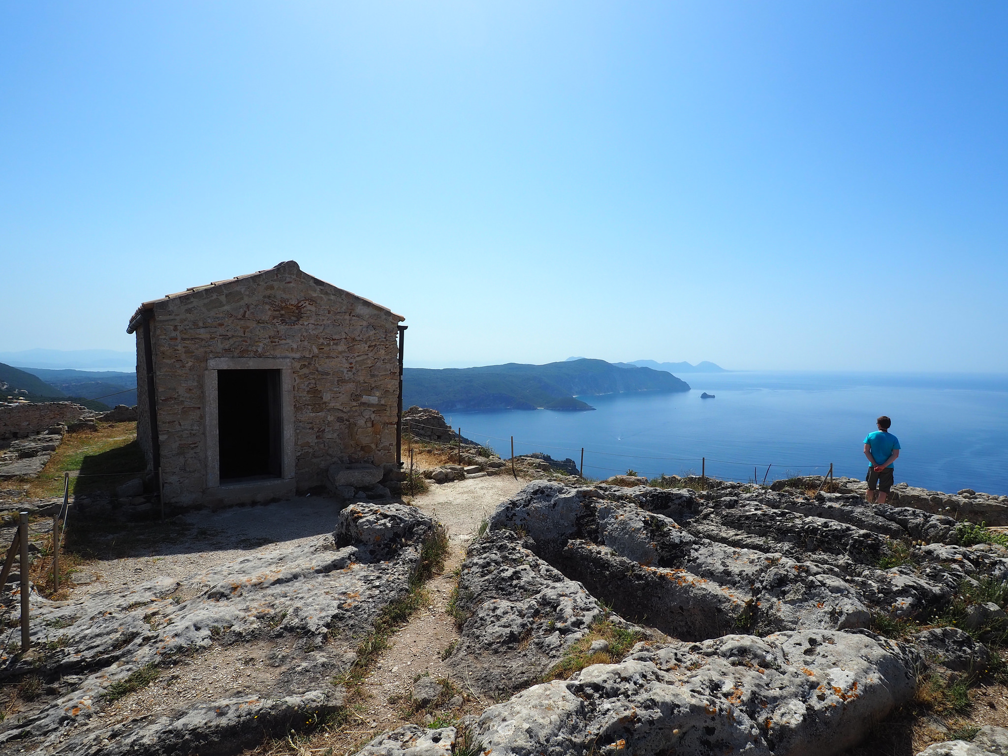 Der Blick vom Pantokrator nach unten ist gigantisch. Bei klarem Wetter kann man beinahe die gesamte nördliche Insel und die albanische Küste überblicken.