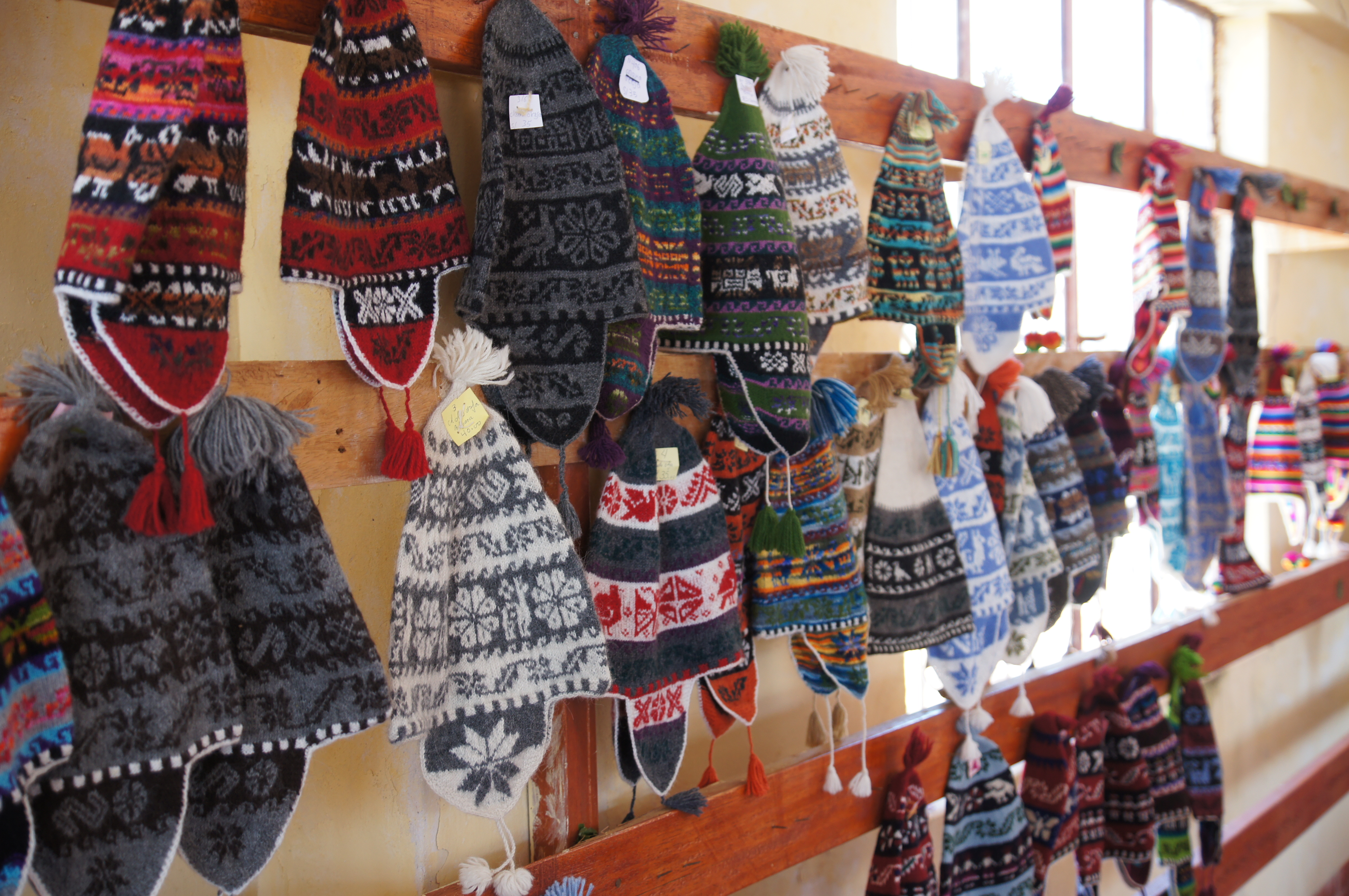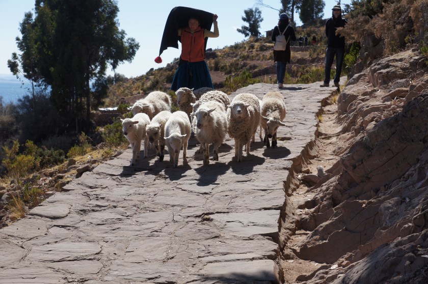 Als wir aus dem Boot kamen, lief uns direkt eine Herde Schafe auf dem Pfad zum Dorf entgegen. Die Gemeinschaft lebt stark vom Kunsthandwerk – Textilien werden gewebt und gestrickt. Aber die werden nicht nur an Touristen verkauft, sie sind im ganzen Land bekannt und beliebt und qualitativ wesentlich hochwertiger als das, was man etwa auf dem Markt am Hafen von Puno bekommt.