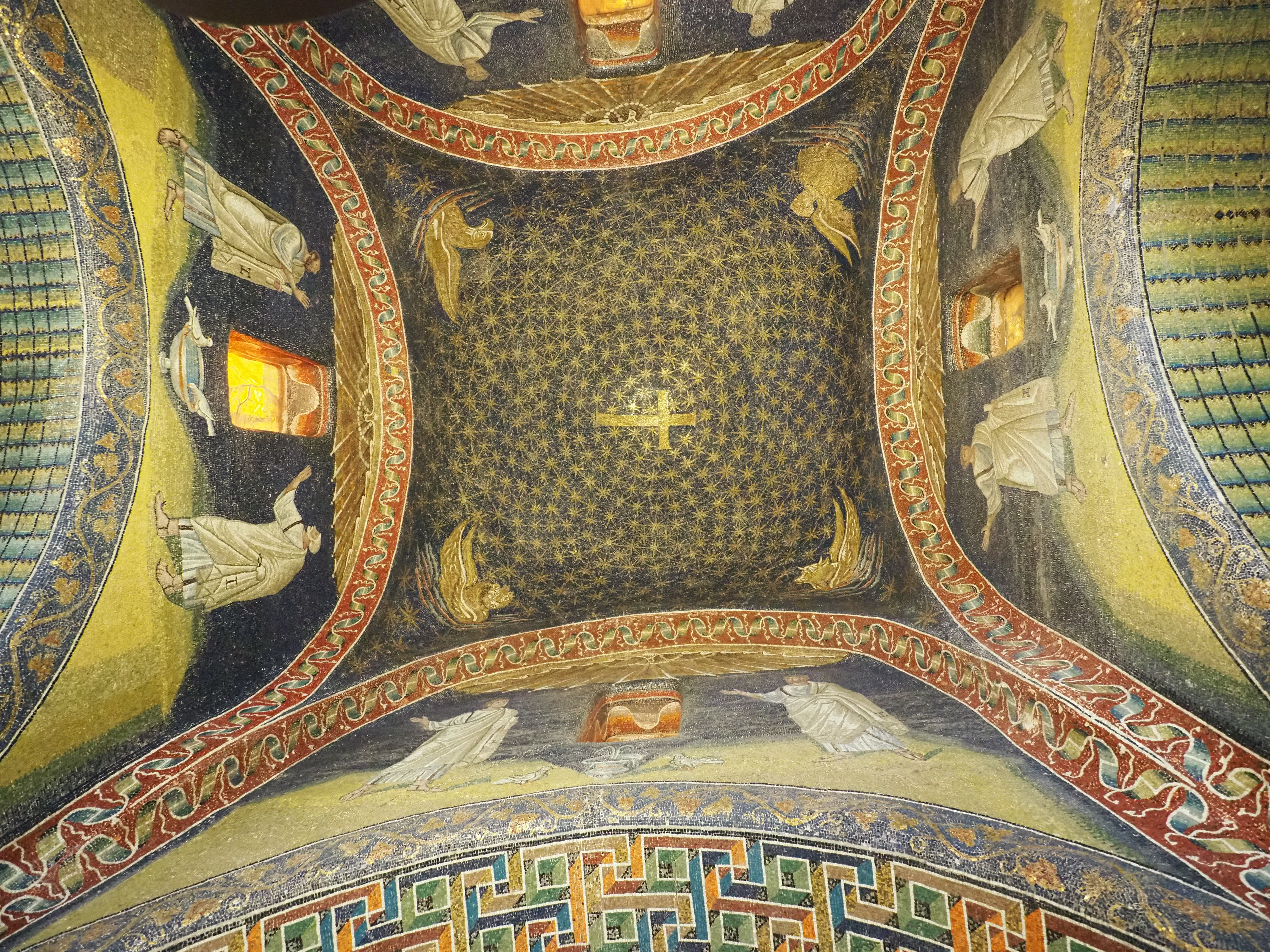 Fenster aus Alabaster tauchen die Kapelle in ein ganz besonders mystisches, gelbes Licht. Die gesamte Kapelle ist mit farbenprächtigen Mosaiken bedeckt. Kaum kann man glauben, dass sie schon vor 1500 Jahren entstanden sind – die Farben haben an Strahlkraft kaum verloren. Typisch für eine Grabkammer haben die figuralen Darstellungen alle ein Hauptthema: Erlösung im christlichen Sinne.