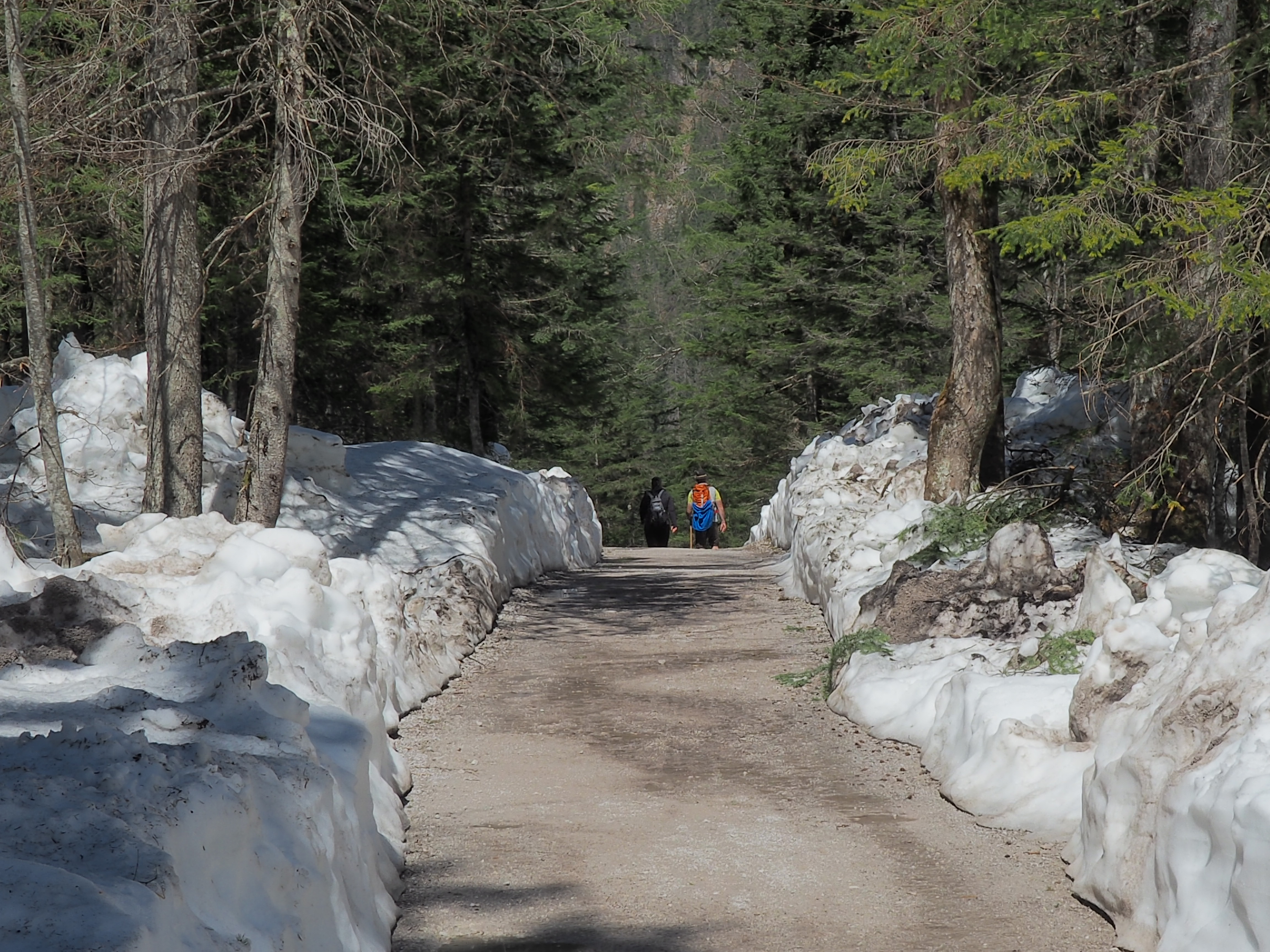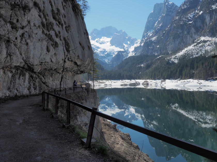 Als wir Ende April zu Ostern dort waren, war nur die Nordseite des Uferwegs am vorderen See geöffnet, am Steilhang war die Lawinengefahr noch zu hoch, zum Teil waren sogar Skifahrer unterwegs, während an der Ostseite schon Kletterer die Wände auf den Klettersteigen des „Laser-Alpin“ bevölkerten. Hinter dem See auf dem Weg hinauf zum Hinteren Gosausee wurden die Schneemassen immer größer – trotzdem war der Wanderweg mit dem Bagger geräumt worden.