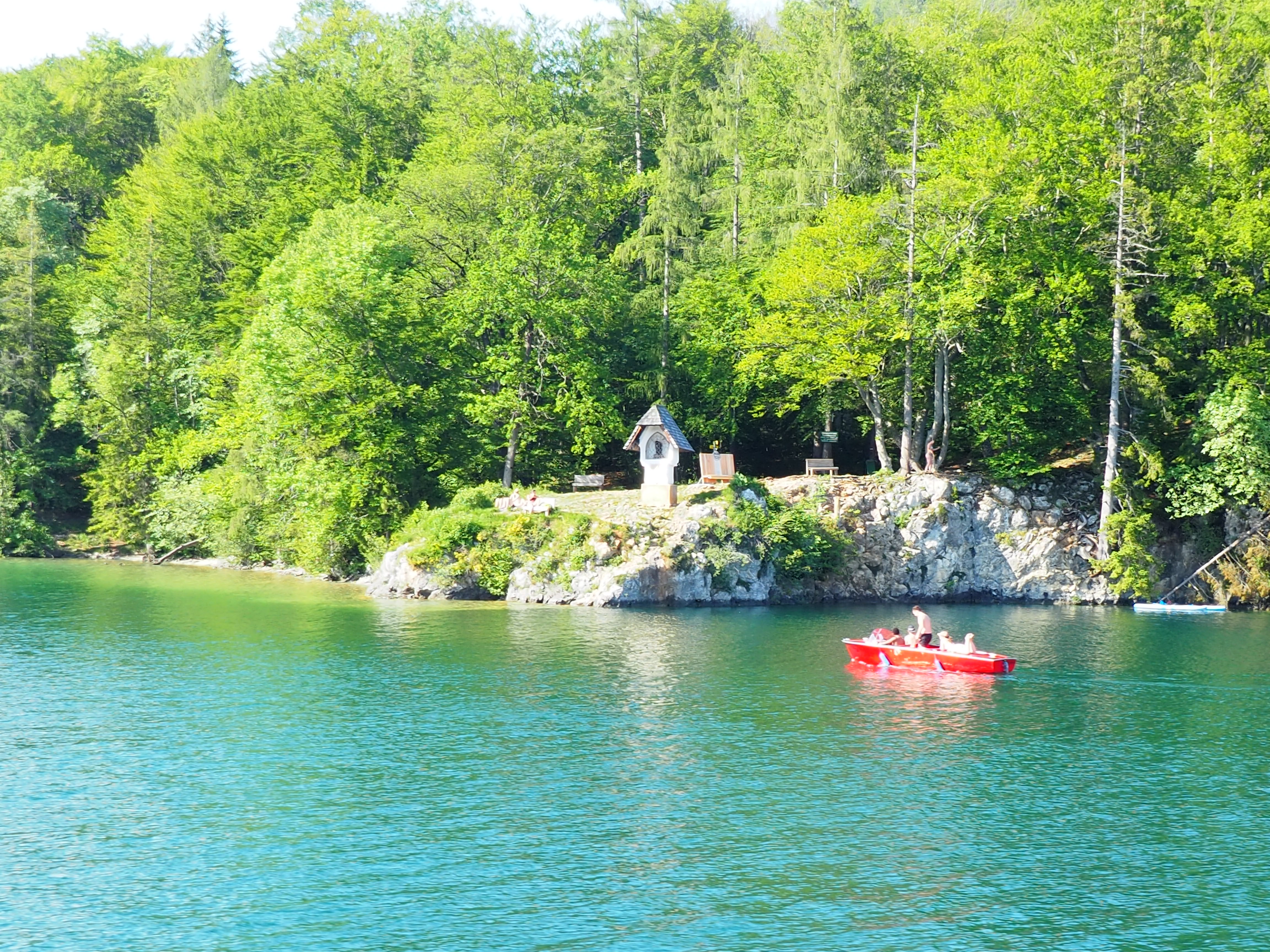 Kann man einen Platz am Sonnendeck ergattern, bieten sich sagenhafte Ausblicke auf den See, die man vom Ufer kaum bekommt – etwa auf das romantische Weiße Rössl, fast wir man es aus dem berühmten Peter Alexander Film kennt oder auch auf die vielen kleinen Badebuchten und Felsen, auf denen sich an diesem Sonntag das erste Mal die Leute in der Sonne räkeln. Auch entdeckt man den einen oder anderen kleinen Altar, der daran erinnert, dass am Ufer zwischen St. Gilgen und St. Wolfgang schon seit Jahrhunderten die Wallfahrer unterwegs sind.
