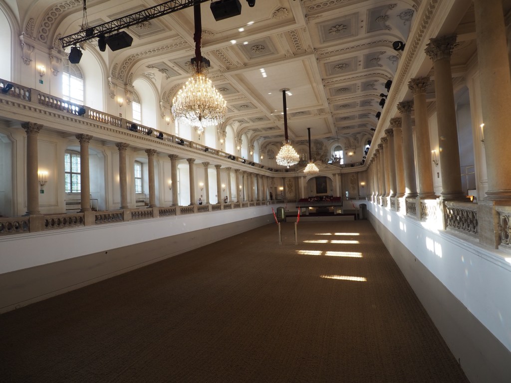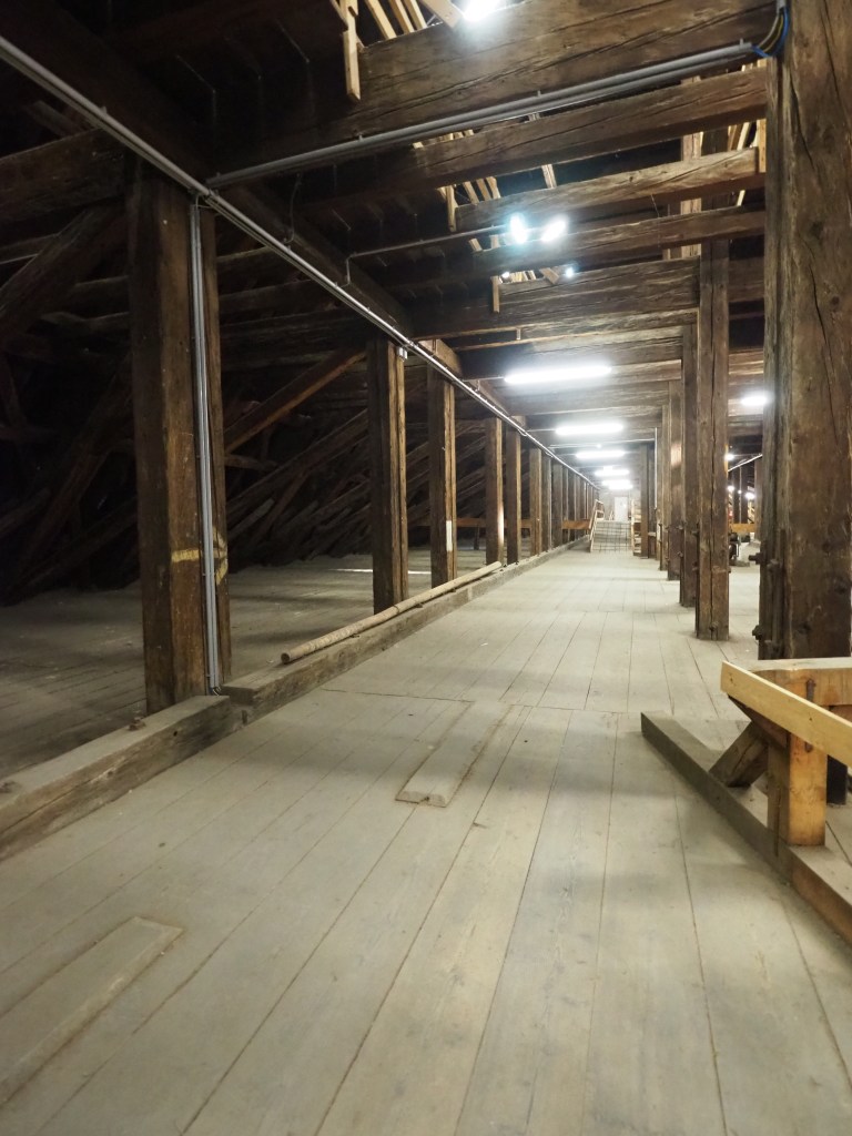 Der Dachstuhl ist weitestgehend noch im barocken Zustand. Einzig die Aufhängung der großen Kronleuchter wurde vor 10 Jahren ersetzt – was früher über eine Art Flaschenzug funktionierte, geht heute elektisch.