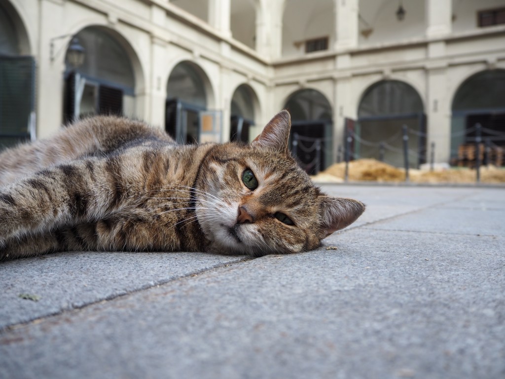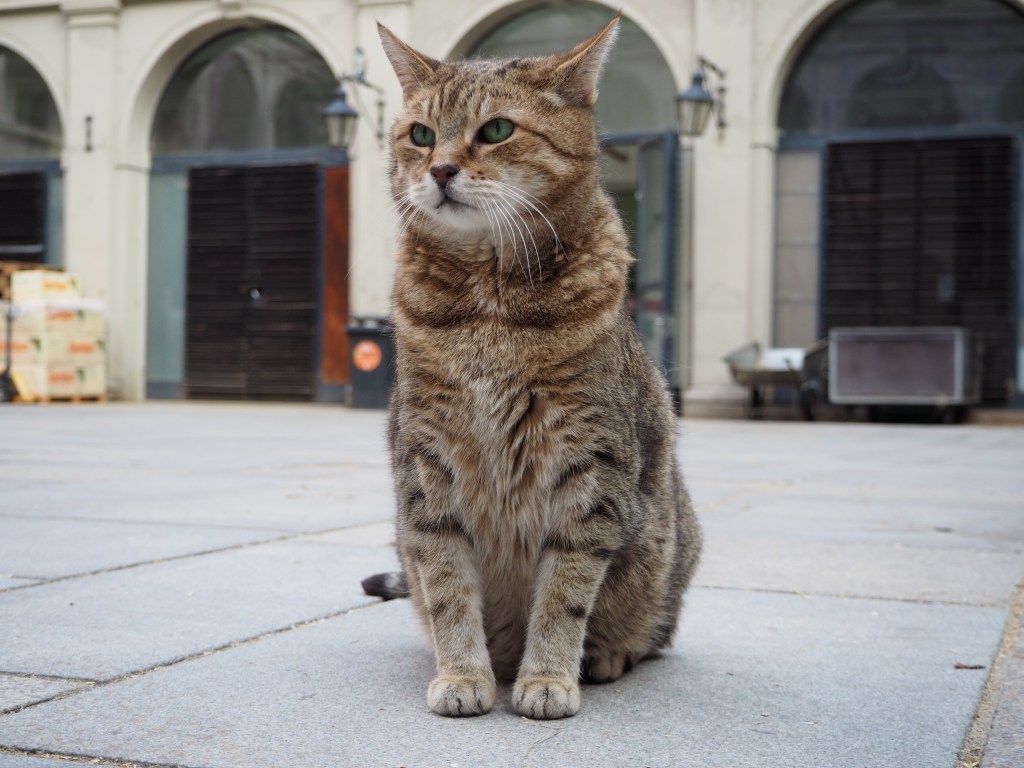 Kultig in der Stallburg sind übrigens die beiden wohlgenährten Stallkatzen Sisi und Garfield, die zwar die eine oder andere Maus fangen, sich wohl aber auch gelegentlich beim Kraftfutter der Pferde bedienen. Bei meinem Besuch in den Stallungen liegen sie gelangweilt im Hof und Warten auf Streicheleinheiten. Die beiden sind die heimlichen Stars der Hofreitschule.