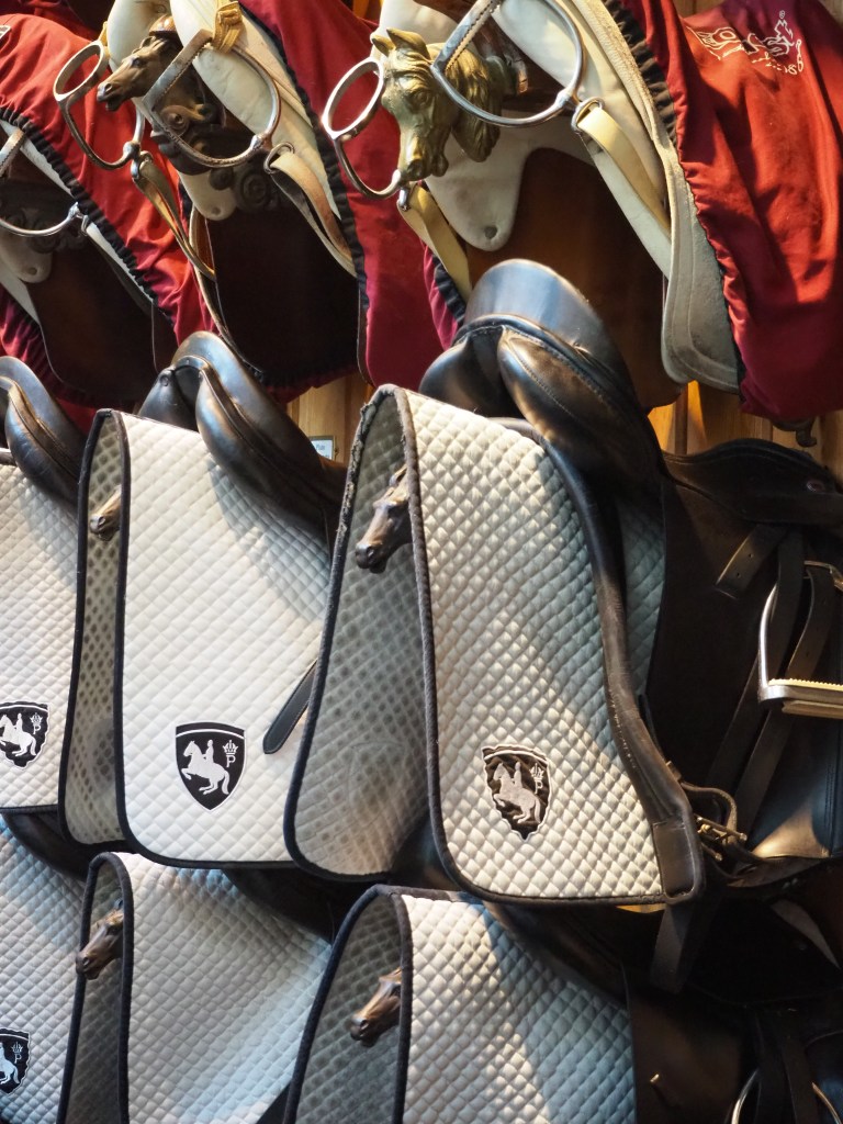 Jeder Hengst hat seine eigene Ausrüstung – genau genommen sind es sogar zwei – eine schwarze fürs Training und eine weiße für die Aufführung. Und nicht jeder Hengst ist jeden Tag in der Aufführung – die Tiere haben auch mal eine Pause.