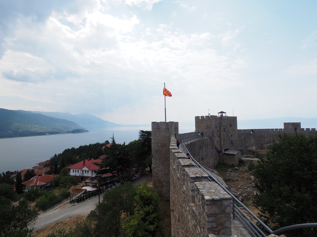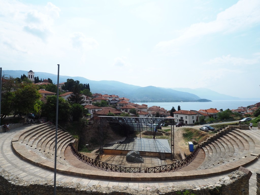 Nun geht es hinauf auf den Hügel, auf dem Ohrid als Siedlung ihren eigentlichen Anfang nahm. Direkt hinter der Sophienkirche geht es steil den Berg hinauf. Dort trifft man zunächst auf das alte Theater. Es ist nahezu perfekt aus der hellenistisch-römischen Zeit erhalten – nur die Bühnenkonstruktion wurde erneuert, weil es noch immer in seiner Funktion genutzt wurd. Von hier hat man einen gigantischen Blick über den Ohridsee und die Stadt.