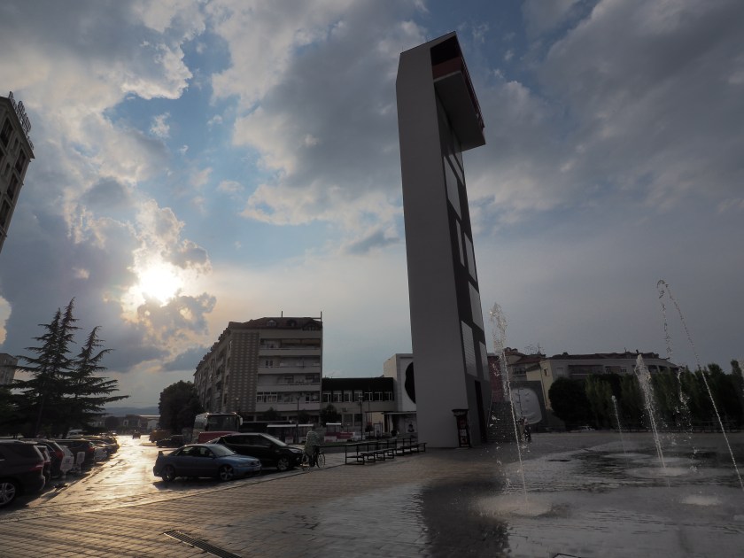 Etwas außergewöhnlich ist der sogenannte rote Turm am Theaterplatz von Korca. Er wurde 2014 eröffnet und bietet den Blick von oben auf die Stadt. Entweder man steigt die Treppen nach oben oder fährt mit dem Lift in den Balkonähnlichen Kopf des Turms. Dort befindet sich ein kleines Café, leider war beides bei unserem Besuch schon geschlossen.