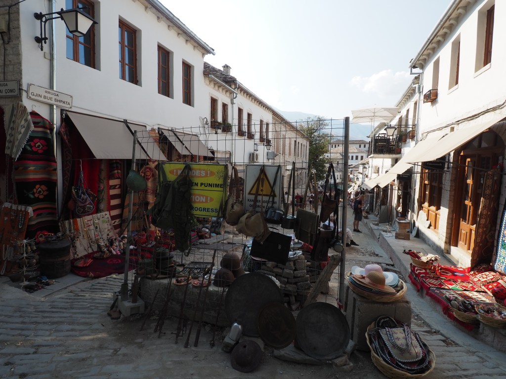 Der Basar von Gjirokaster wirkt als eine Einheit von kleinen Geschäften mit Wohnungen darüber beeindruckend. Es werden auch nicht nur die 08/15 aus China importierten Souvenirs angeboten, sondern auch kleine Teppiche und Schnitzwaren. Er lädt zum Stöbern ein.