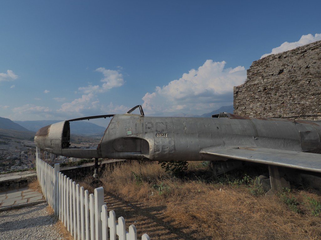Etwas skuril ist dagegen die Geschichte des amerikanischen Düsenflugzeugs, das sich im Burghof befindet. 1957 wurde die Lockheed T-33 in Tirana zur Landung gezwungen. Die Amerikaner sagen, der Pilot habe in Italien aufgrund des starken Nebels die Orientierung verloren und sei deshalb in Albanien gelandet. Die Albaner sagen, er habe sich auf einer Spionage-Mission befunden und sei entdeckt wurden. Was stimmt, lässt sich heute nicht mehr nachvollziehen. Der Pilot wurde kurze Zeit später wieder freigelassen, das Flugzeug, das wohl auch bei der Landung beschädigt wurde, blieb in Albanien und wird seit 1971 in Gjirokaster ausgestellt – als eine Art Trophäe, auch wenn inzwischen zahlreiche Teile fehlen und auch die Aufschrift US Forces inzwischen in der Sonne verblasst ist.