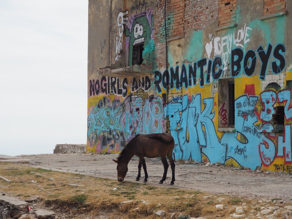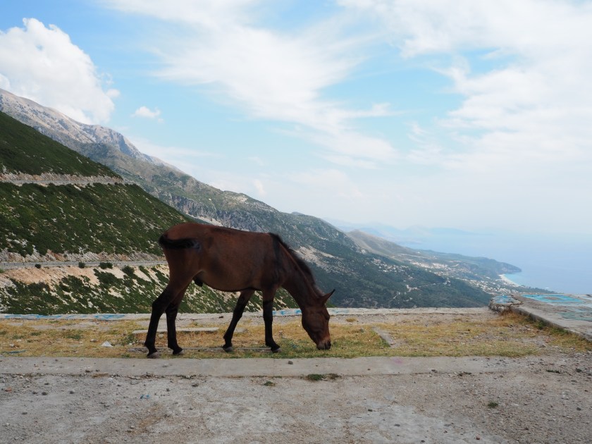 Es ist nur wenig los an diesem Nachmittag im September. Ich bin mir relativ sicher – läge die Passstraße irgendwo in Mitteleuropa, hätte man hier nicht so viel Ruhe und Platz in dieser beeindruckenden Landschaft – sicher wäre es hier überfüllt und das dröhnen der Motorräder wäre zu hören. Nicht aber am Llogara Pass, als wir bei dem verlassenen Hotel stoppen, hören wir nur das Kauen der Esel.