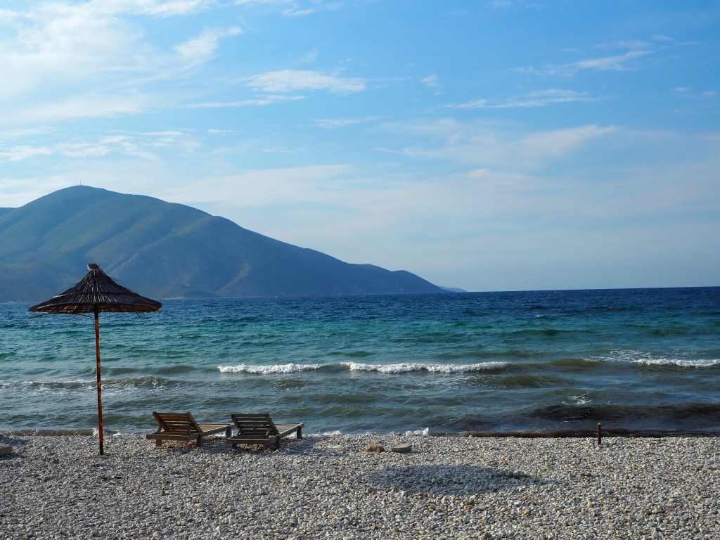 Als Ziel des perfekten Roadtrip-Tages haben wir uns für das kleine Städtchen Orikum entschieden, das am südlichen Ende der Bucht vor Vlora liegt. Hier haben wir uns ein Hotel direkt am Kiesstrand ausgesucht, die eigentliche Stadt liegt rund einen Kilometer entfernt vom Strand in der Ebene. Hier geht es entspannt zu, einige Restaurants liegen direkt am Strand, also lassen wir die Seele ein bisschen baumeln, bevor es am nächsten Tag weitergeht in das Gebiet um Vlora. Zum Baden ist es zwar leider schon ein bisschen zu kalt und zu windig, aber im Liegestuhl liegen und den Wellen zuhören geht ja immer.