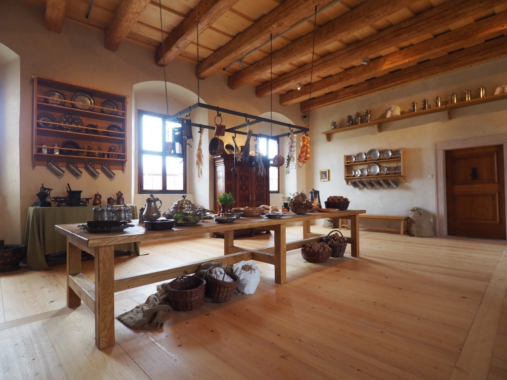 Hier kann man sich zwischen der historischen und der naturgeschichtlichen Führung entscheiden. Erstere führt (mit u.a. deutschsprachigen Audioguides) durch die historischen Räume der Burg. Dazu gehört der berühmte Wappensaal, ein Saal für die wilden Jagdgelage sowie eine große, helle Küche mit Speisen, die damals in Tschechien bekannt waren – etwa Kartoffeln.