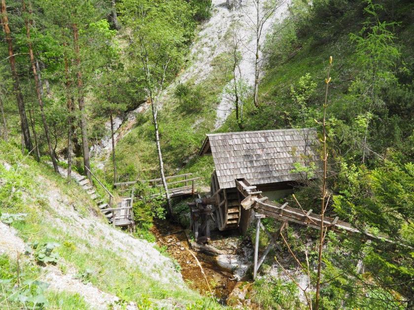 Hier verlassen wir den Flusslauf der Erlauf und steigen steil hinauf zum Erlaufstausee, vorbei an einer wieder errichteten alten hölzernen Mühle. Ab hier wird es flach, der Weg teilt sich am Stausee.