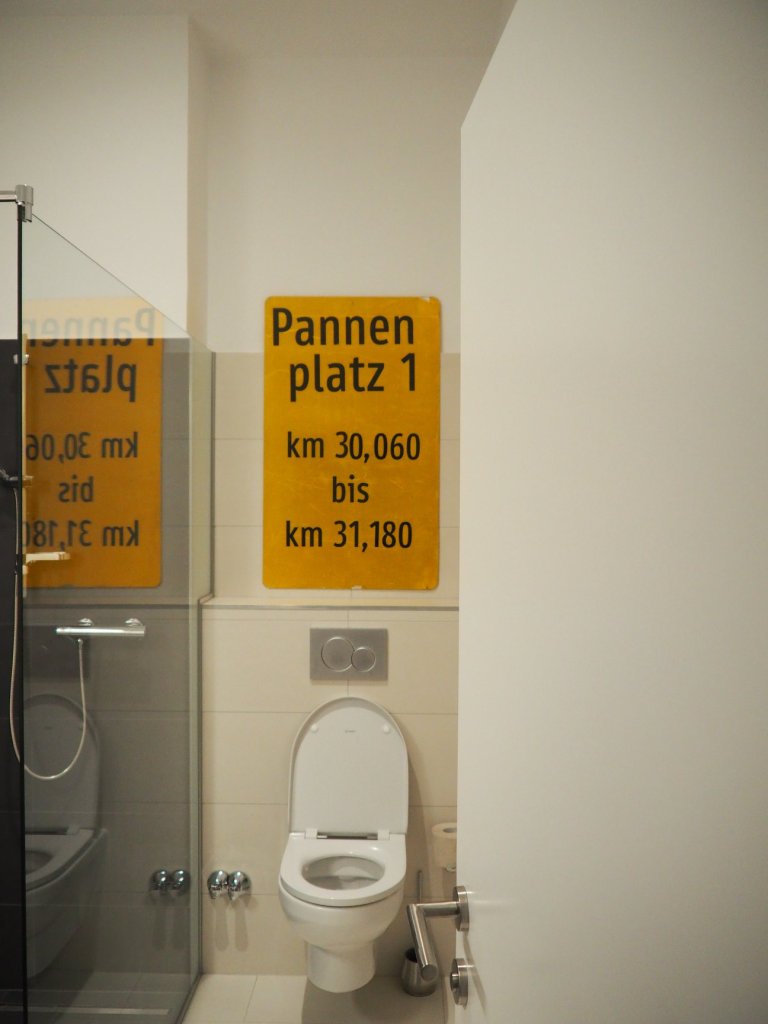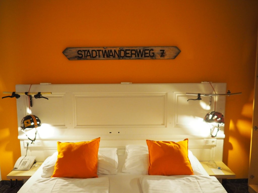 Im Zimmer „Bewegung“ wurden Fahrradhelme zu Nachtleuchten umgestaltet und als liebevolle Homage an Wien wurde ein Stadtwanderweg-Schild angebracht.