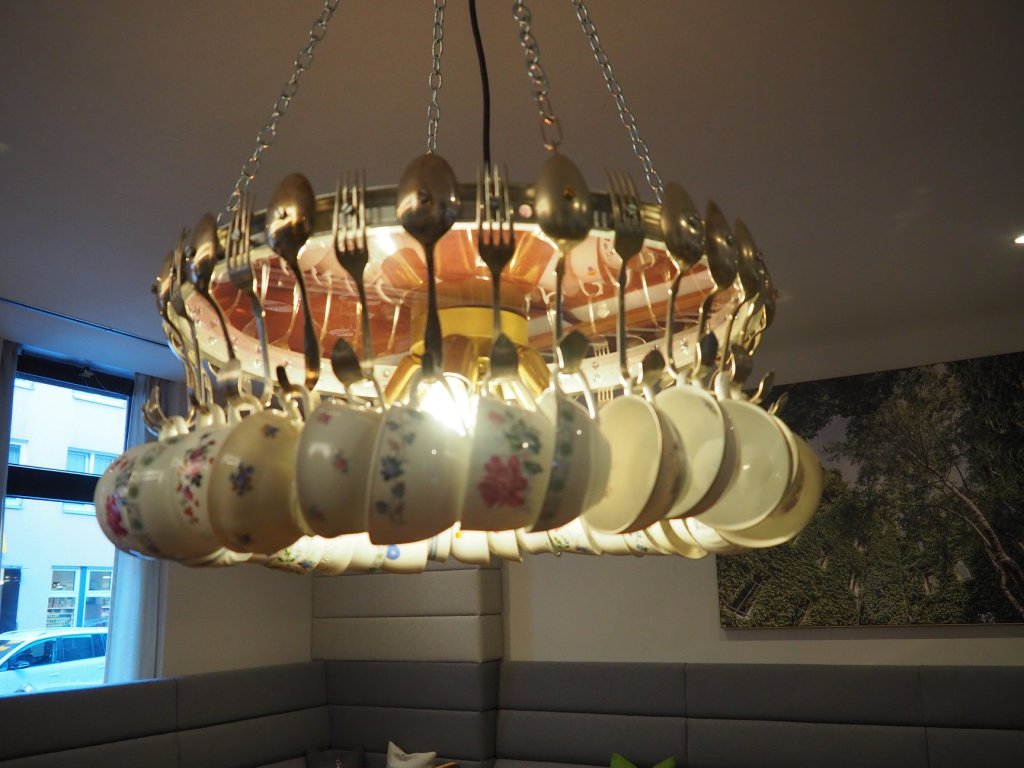 Für all die liebevollen Details, die sich in den Zimmern und im Frühstücksraum finden, ist Michaela Reiterer immer wieder auf den Wiener Flohmärkten unterwegs, baut mit ihren Handwerkspartnern Uhren oder Lampen aus alten Tassen und Gabeln, sammelt Stühle zusammen, kauft alte Schilder auf und kommt dabei auf Ideen, die man selbst nie hätte.